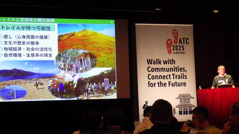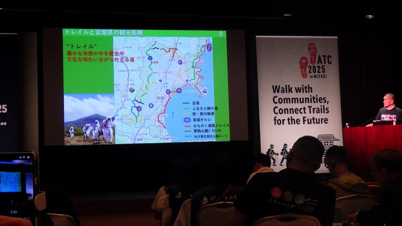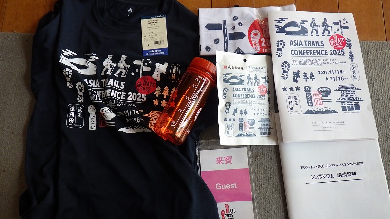 アジアトレイルカンファレンス 2025年11月14日この日、表記の集会があり、参加してきました。トレイルにかかわる方々の集まりです。遠刈田温泉と多賀城のオルレコースの開設に合わせて、宮城県が主催したもの。遠刈田温泉のホテルメルキュールで開催されました。 アジアトレイルカンファレンス(ATC)ということで外国からも参加していました。宮城県知事、蔵王町長などの挨拶の後、書道家のパフォーマンス。辰野勇モンベル会長の基調講演。それに続いて昼食。おにぎりと豚汁が出ました。 午後は、各国のトレイル団体の報告、パネルディスカッション、アメリカと南アメリカのトレイル団体の災害にかかわる報告、オーストラリアのトレイルと観光の講演。それに続いて、宮城県副知事の小林徳光氏による講演。この中で蔵王古道について触れていただきました。 長い一日でありましたが、いろいろ学び考えることがありました。そしてたくさんの記念品をいただきました。