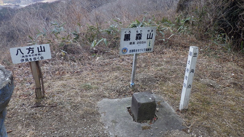 下山後に知ったのですが、この三角点は、昭和19年に移転されて作られたようです。その前は四方山に明治25年9月7日に設置されその時の点名は「四方山」になっていたようです。一等三角点は、明治期の測量の基本になった点なので、こういうケースは聞いたことがありません。これについてのいきさつはよくわかりませんが、あるコメントによると、第2次世界大戦末期の昭和19年には四方山に高射砲陣地がつくられたことと関係があるかもしれない、とありました。地図は、国防の資料という、当時の、陸軍陸地測量部が管理していたことと関係があるかもしれません。当地の歴史探索者の研究を望みたいと思います。