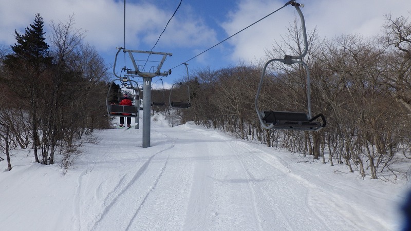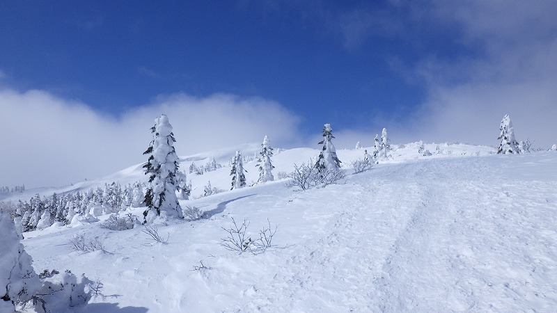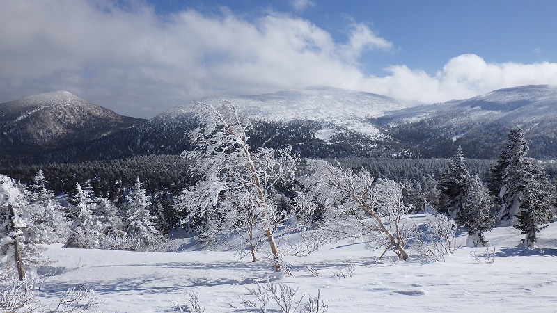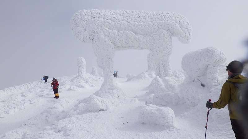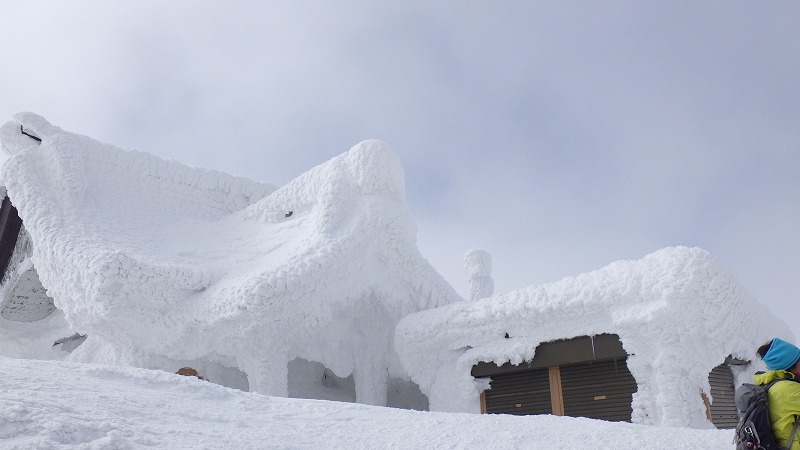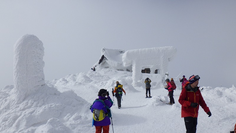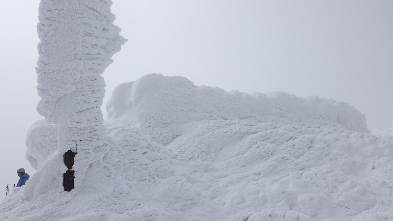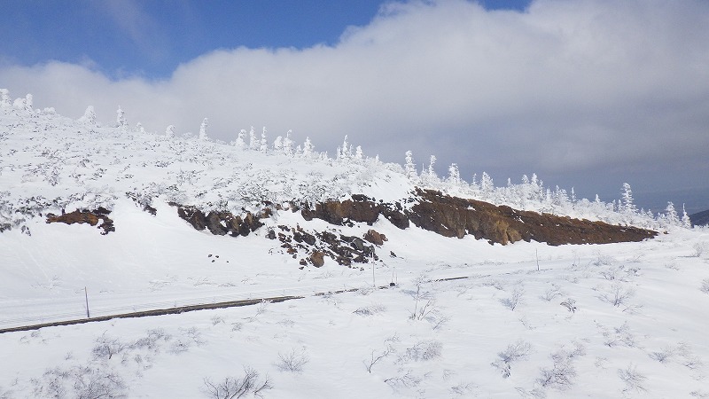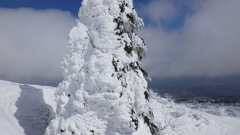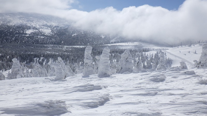 風はなく、山頂での昼食時間。初めてのことです。帰途は、せっかく来たので樹氷原経由で。このころ少し雲がかかりましたが、幻想的な樹氷原を歩きながら、エコーライン・中央コースを経て、3時半にすみかわスキー場に戻りました。