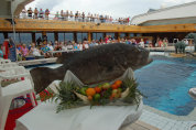 10時から、King Neptune Ceremony とか言うのが、リドデッキのプールであるとかで行ってみる。そのまま訳すと「海王ネプチューンの儀式」だが、「赤道祭り」かな。海賊風の飾り付けと衣装のバンドも出ていて、カクテルを配っている。始まると、三ツ又鉾を持った海の王ネプチューンとその妻の衣装を着た主役登場、船のキャプテン他お偉方が登場のあと、それぞれの持ち場のクルーたちの代表が次々と、海賊に引き立てられ、「罪状」を宣告され、刑として、「フィッシュにキッス」させられたあと、クリームを塗りたくられ、判定により、プールに落とされるか、助かるか、というたわいのない「あそび」が繰り広げられた。アメリカ人はこういうのにうち興じるのが好きなのだなあ。