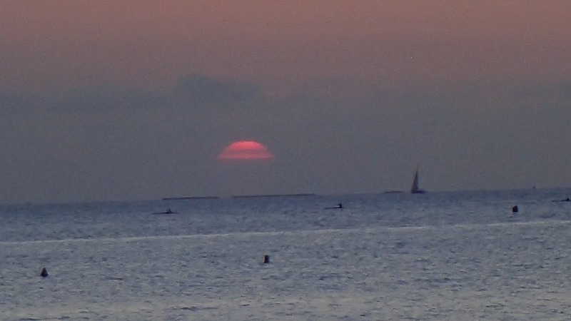 海に降りると、何やら不思議な景色が。パラグライダーがいくつも飛んでいますが、高く昇らないのです。近くで見ると、パラを動力にしてサーフィンをやっています。なんというのか知りませんが、初めて見ました。次々と新しいものが現れます。