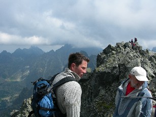 頂上部は狭く、人がひしめき合っている。これまで登ってきた北側(ポーランド側)の他、南側(スロバキア側)の山々が見えている。いずれも鋭い岩峰である。Rysyの標高は2499mで、同じような高さの山々が見えている。頂上には、ポーランドの看板(Rysy)とスロバキアの看板がつけられ、国境の山であることがわかる。天気は晴れ。見通しよく、スロバキア側の登山道が、2つの山上湖の脇を通っているのが見えている。西側にも、東側にも峰々が続いている。このあたりは東経20°05′北緯49°11′と緯度が高いのでこの高度でもはるかに植生限界をこえているから、どれも浸食された岩山で、日本でいえば、北アルプスの穂高連峰のような岩山である。