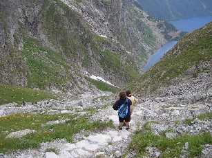 山頂で写真を撮ったり、一休みして、15分後に下山開始。19時の最終バスを意識しての事である。登りに5時間半かかっているから、4時間半で下山しなければならない。こういうところにも朝の1時間の影響が出ている。トラバースをし、登ってくる人たちとすれ違いながら、岩稜を鎖を頼りにどんどん下っていく。登りであれほどあえぎながら通ったのが嘘のようだ。20数分で相当下まで降りてしまった。山頂が遙かかなたに見える。登山者の数は相当少なくなり、待ち合わせの時間が少なくなっている。1時間で尾根の下の広場に出る。鎖場はここで終わり。少し休んでから下山を続ける。急なカール壁にジグザグにつけられた道を降りていく。途中、2人の修道女があのロングスカートの裾をはしょりながら歩いて降りていたのにびっくり。40分で上の湖「黒い湖」に着く。
