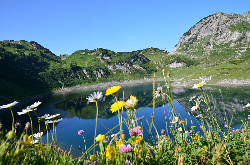 レッヒはザンクトアントンからポストバスで30分の所にある、高級リゾート地。ここには2泊してハイキング。1日目は、オーバーレッヒ(OberLech)からケルバー湖(Koerbersee)、カルベレ湖(Kalbelesee)までのコース。途中、石灰岩地形のドリーネを通る。牧草地の中の楽しいハイキングコース。ケルパー湖のほとりで昼食のあと、カルベレ湖のさきからバスでレッヒに戻る。時間があるので、Rifikofにロープウェーで往復。山上のレストランで、エーデルワイスの鉢植えを見ながらビールで乾杯。